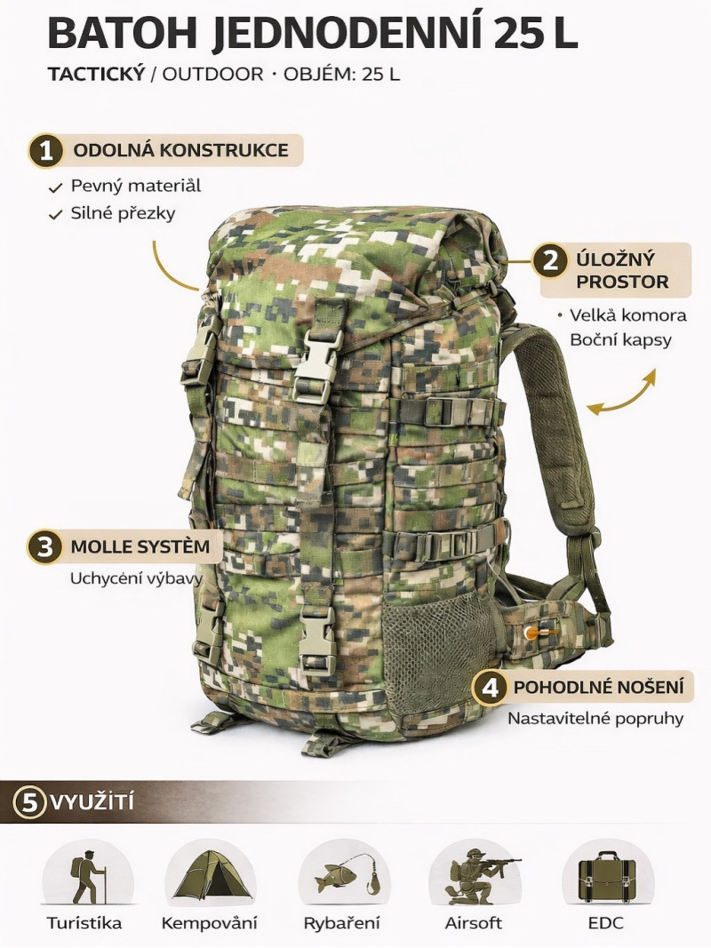 Batoh jednodenní 25l slouží k uložení osobního materiálu uživatele.